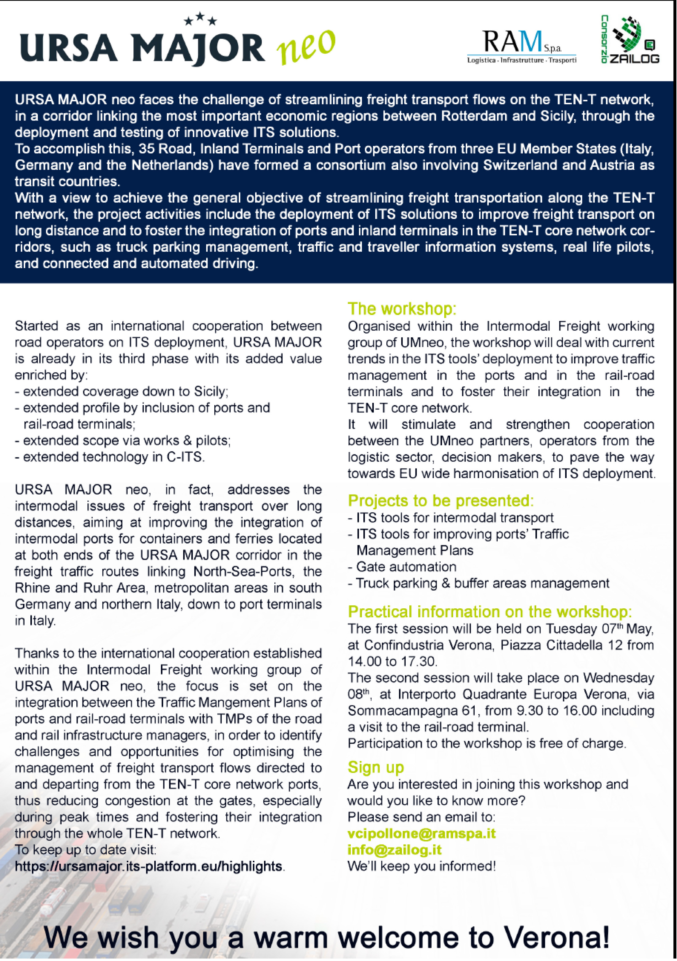 On the 7th and 8th of May, in Verona will be held two days of workshop about Veneto Intermodal and Ursa Major Neo. Both are EU projects funded by CEF programme. On the morning of the first day, there will be the kick-off meeting of Veneto Intermodal whereas the workshop of Ursa Major Neo will take place during the afternoon of the 7th of May and in the entire following day. During the kick-off meeting of Veneto Intermodal, several thematic will be discussed, focusing especially on the improvement the railway infrastructure of three Italian key nodes: Verona, Padua and Venice. The partners of the project are RFI (the Italian railway infrastructure manager), Consorzio ZAI (the infrastructure manager of the Verona freight village), Veneto Region and Venice Port Authority. Each partner will receive European funds to produce: