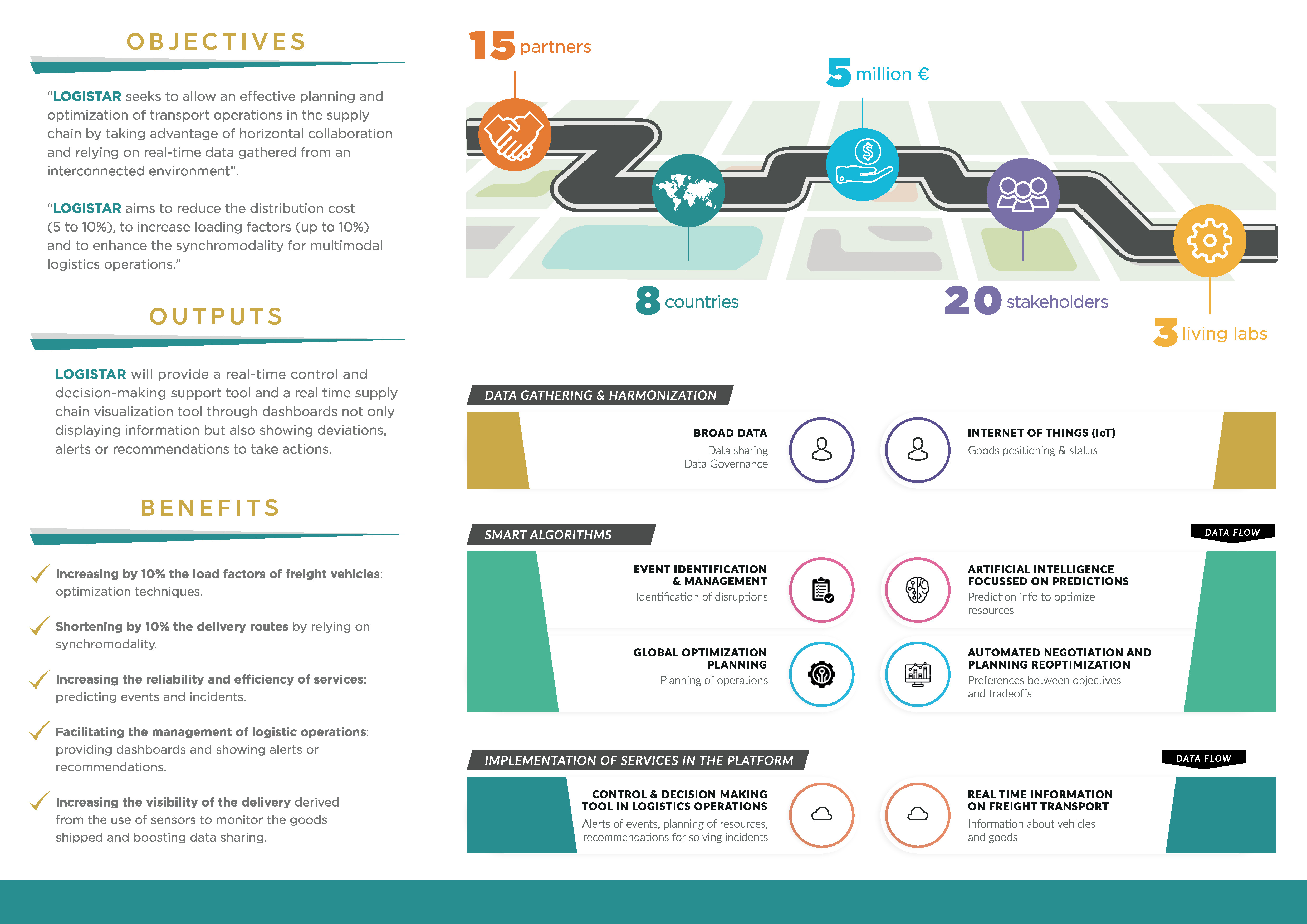 LOGISTAR project proposes the intensive use of Internet of Things, Open Data, Artificial Intelligence, Optimisation techniques and other ICT advances for effective planning and optimizing of transport in the logistics sector.